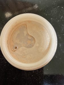 ファンデーションを蓋に耳かき1~2杯分出します。専用のブラシを(わたしはいいのがあればそれでもいい、と思っています)使い、蓋のなかでクルクルと円を描いてファンデーションをブラシの内側に含ませます。この時にしっかりクルクルすることで、粉がクリーミーに変化します。